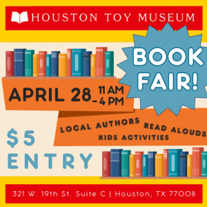 Book reading and signing event at the Houston Toy Museum April 28, 2024. Tickets are $5 (ages 5 and under are FREE) and include entry into the museum (normally $14 for adults and $1-13 for kids!) Purchase your tickets here.
